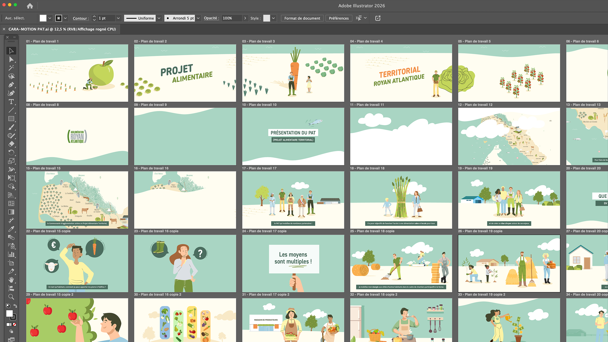 J’ai assuré la direction artistique du projet en collaboration étroite avec l’équipe communication de la collectivité, depuis l’analyse du brief jusqu’à la conception du storyboard et la réalisation des styleframes. Le travail a porté sur la construction d’un univers graphique illustré, chaleureux et lisible, en cohérence avec l’identité institutionnelle de la Communauté d’Agglomération et adapté à une diffusion grand public, à partir d’illustrations existantes (client et banques d’images) retravaillées et adaptées au projet.