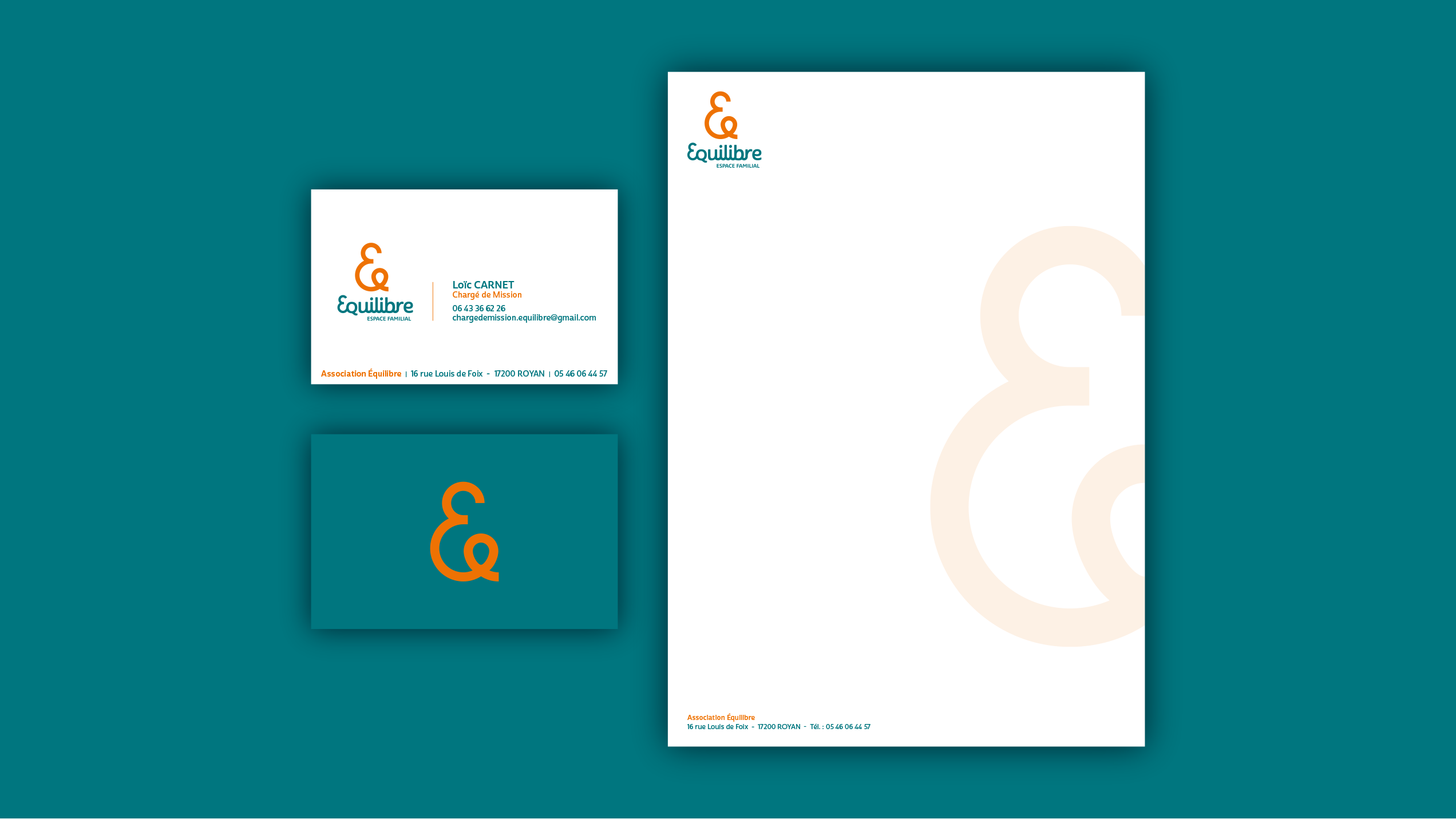 Conception d’un signe graphique basé sur l’esperluette, symbole de lien, d’équilibre et de relation, et définition d’un univers coloriel dynamique et rassurant. Mise en place d’un système visuel adaptable, décliné sur les supports de communication de l’association (papeterie, supports imprimés, objets et supports institutionnels), garantissant cohérence et lisibilité. J’ai également créé le design d’interface du site internet